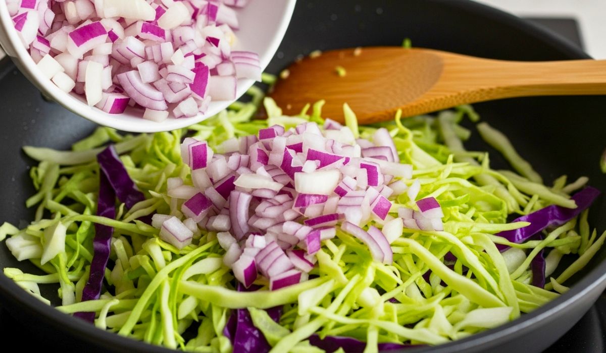 - Stir the chopped onions to the cabbage so that the casserole can have an added taste and soft sweet flavor.